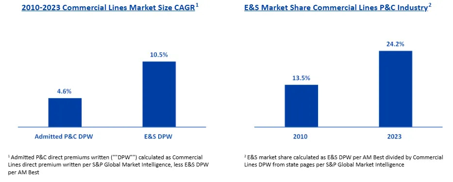 Management points to a 30-year history of E&S outgrowing the admitted market and, according to A.M. Best, E&S premiums as a share of P&C premiums has more than doubled over the last 20 years, from 4.3% in 2001 to 10.1% in 2021. Within commercial lines, where Kinsale predominantly plays, E&S share is even greater: