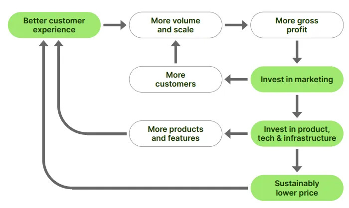 Growing volumes drive lower unit costs through lower bank transfer fees and greater leverage on engineering and product development, which in turn produces more gross profits that, beyond a sustainable margin target, are reinvested in product, marketing, and price, which in turn draws more volume (this is akin to Ryanair using cheaper tickets to attract more passengers, who are then leveraged to negotiate lower landing fees and aircraft prices, with the resulting savings then feeding back into cheaper tickets). Enchanted by low fees and fast transfer speeds, customers promote the service to friends and family - around 2/3 of new customers come through word-of-mouth - reducing the Wise's reliance on paid marketing to drive growth. In its most recent fiscal year (ending March 2024), Wise spent just £37mn of marketing against £119bn of transfer volume while LTM through June ‘24, Remitly spent $282mn against $46bn).