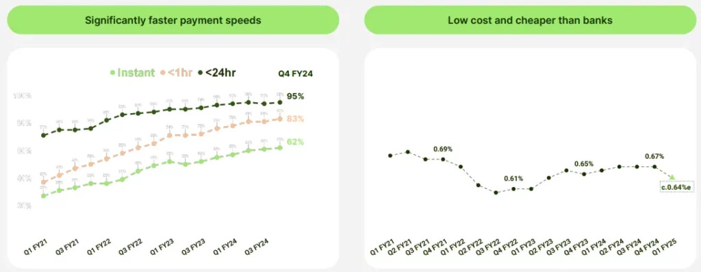 But in exchange, Wise gains near-total control over the payment flow and can move money at the same speed and cost as a local bank. In the UK, it was the first non-bank to plug into the Faster Payments Service (FPS), the country’s real-time settlement network, cutting out roughly 90% of partner bank fees and reducing transfer times to under 20 seconds. In Hungary, a direct link to the central bank trimmed costs by 14% and pushed the share of instant transfers (< 20 seconds) from 17% to 82%. Since then, Wise has integrated with central banks in Australia (again, as the first non-bank), Singapore, the Eurozone, and most recently Brazil, where it also secured a second license as a payment institution. So in addition to tapping local rails through its 90+ banking partners, Wise has (or will soon have) direct access in six countries.