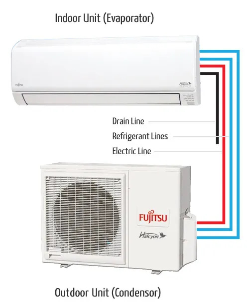 At a high level, HVAC equipment comes in one of two categories – ducted and ductless. Ducted systems – standard in the US, where the housing stock is heavily skewed toward single-family homes – use a central unit to distribute conditioned air throughout a home through a network of ducts hidden in walls, ceilings, or floors, with air delivered through vents in each room. Ductless systems (primarily heat pumps) do away with the ductwork, connecting an outdoor compressor to one or more indoor units mounted directly on walls or ceilings in individual rooms, as seen here: